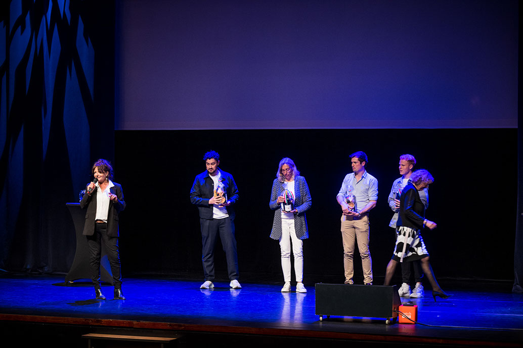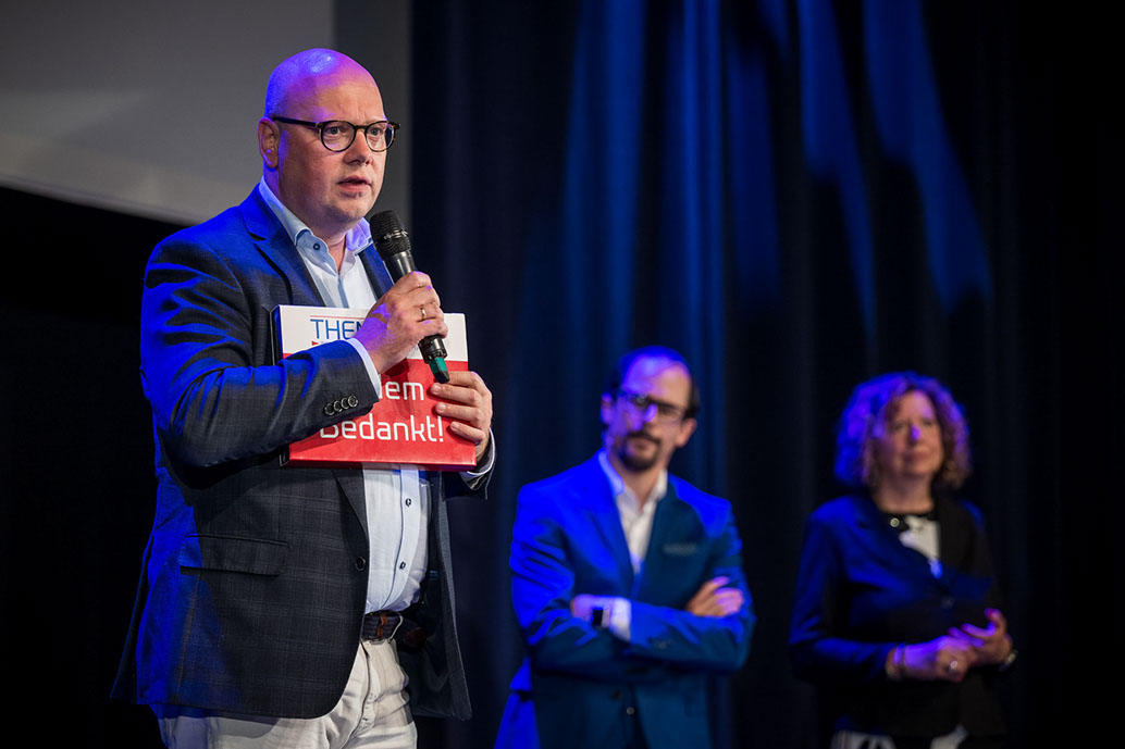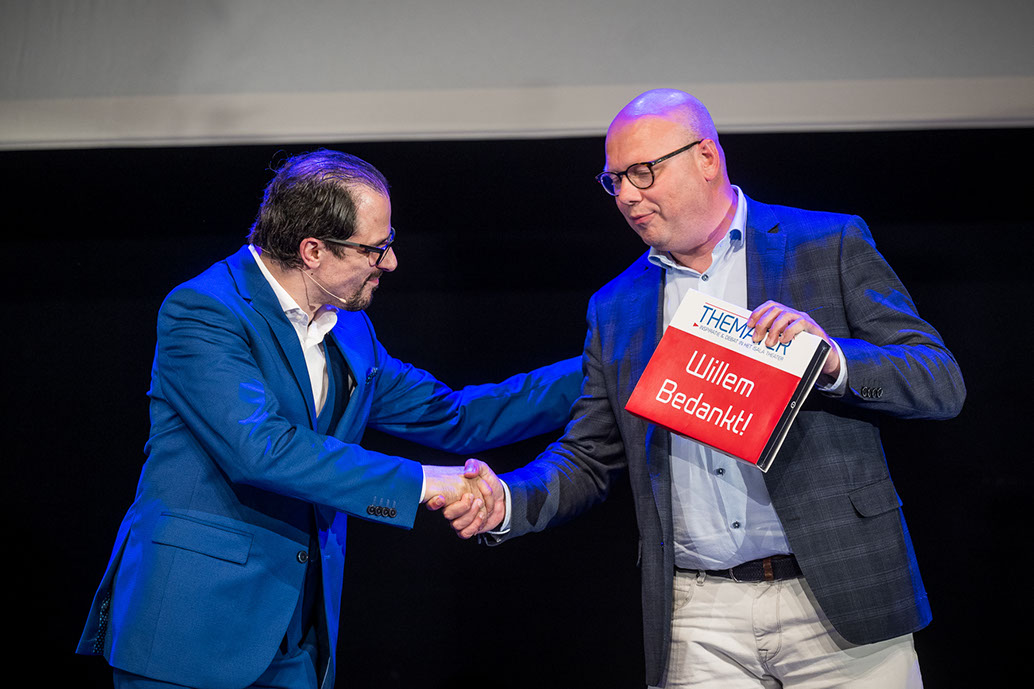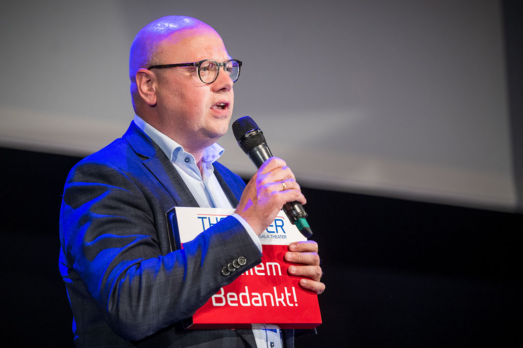 Uit handen van Bestuursleden Yole Rizzo en Pouria Taghavi kreeg hij een presentje voor zijn jarenlange inzet in het bestuurd van Stichting Themater. Ook stond ons nieuwe bestuurslid Annelous van der Klauw-Cornet op het podium.