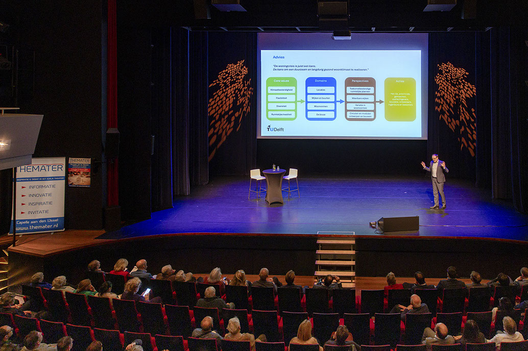 Wij begonnen de avond met een uitstekende inleiding door dr. Ulf Hackauf – verbonden aan de universiteit Delft (Bouwkunde) in lid van het Vision Team Wonen. Dat team heeft een mooie visie ontwikkeld voor de toekomstige bouwopgave waarbij niet zozeer de kwantiteit (die 100.000 woningen die jaarlijks gebouwd zouden moeten worden maar nooit worden gehaald!) maar de kwaliteit en flexibiliteit centraal staan. Daarbij is ook ruim aandacht voor klimaatbestendig bouwen. Variatie in woonvormen en circulair en modulair bouwen zijn belangrijke uitgangspunten. Ook bij een thema als verdichting staat (bouw- en woon)kwaliteit voorop. In de nota Ruimte voor Wonen (TUDelft) is alles na te lezen Een visie op de toekomst van wonen in Nederland.